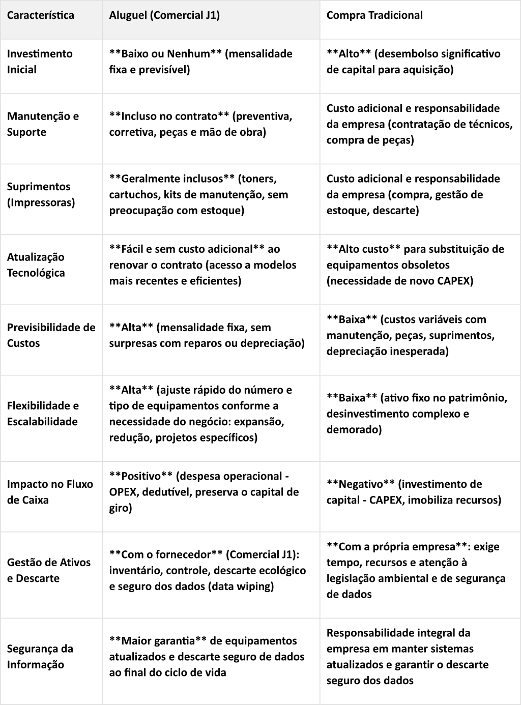 Diferenciação: Aluguel vs. Compra Para que sua empresa em Sorocaba possa tomar a decisão mais estratégica e financeiramente vantajosa, é fundamental entender as principais diferenças e os impactos de longo prazo do aluguel em comparação com a aquisição tradicional de equipamentos. A tabela abaixo resume os pontos-chave, destacando como o modelo de locação com a Comercial J1 se posiciona como uma alternativa superior em diversos aspectos críticos: